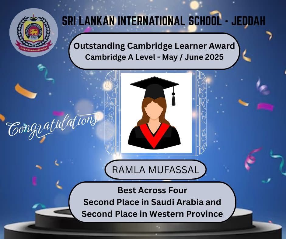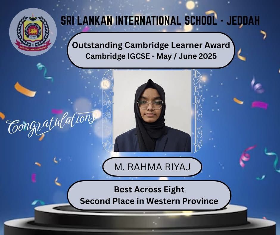 Sri Lankan International School Jeddah is immensely proud to honour the exceptional accomplishments of our students in the Cambridge Examinations (CAIE) May/June 2025 series. Their remarkable performance has brought great distinction to our school and stands as a testament to their dedication, perseverance, and academic excellence.